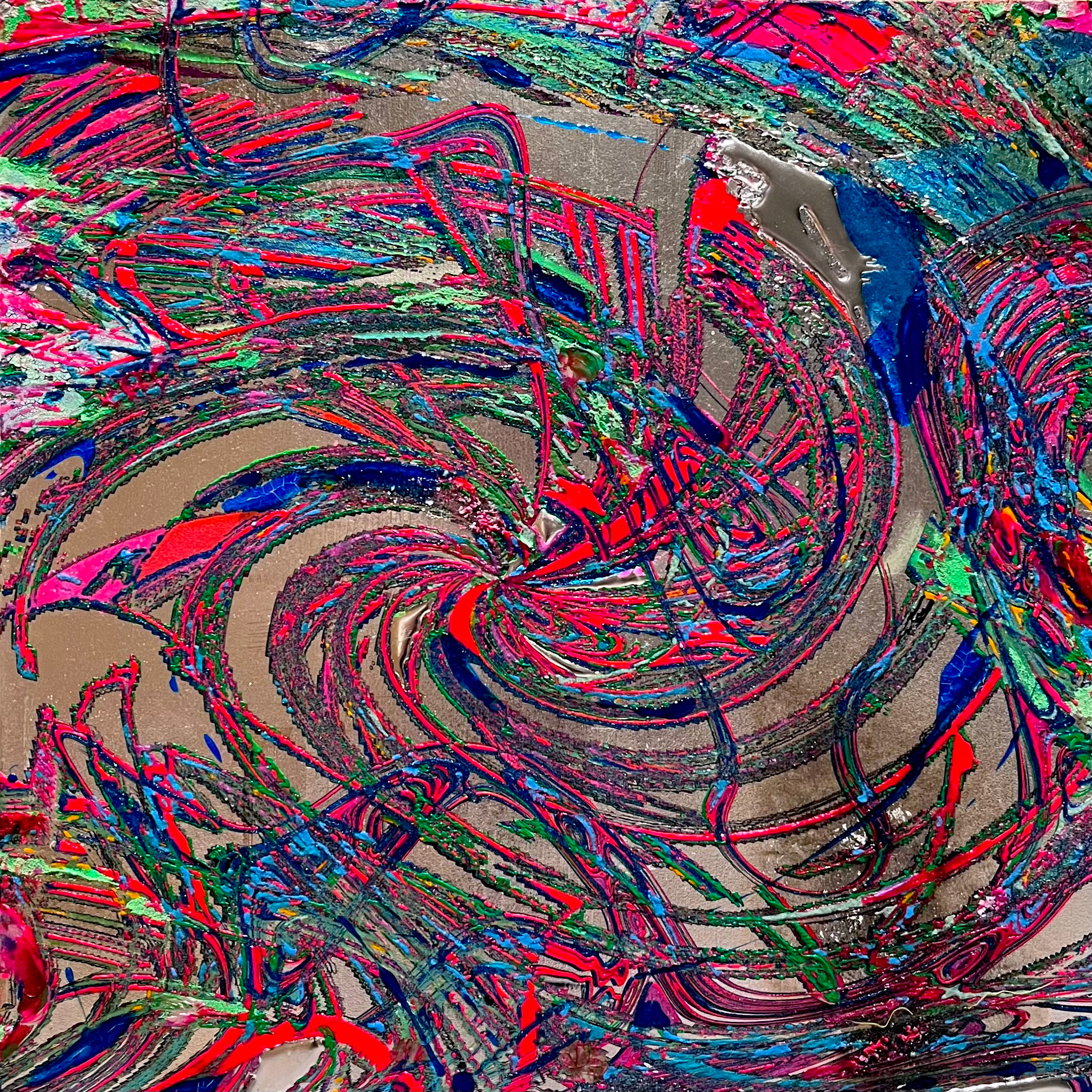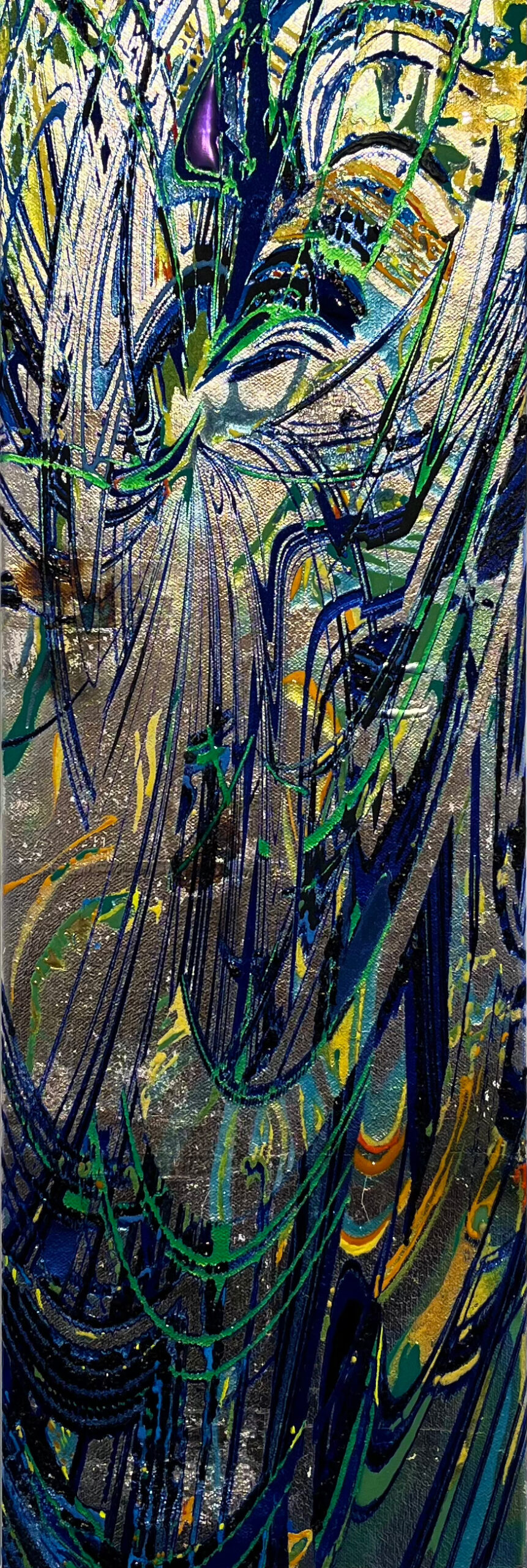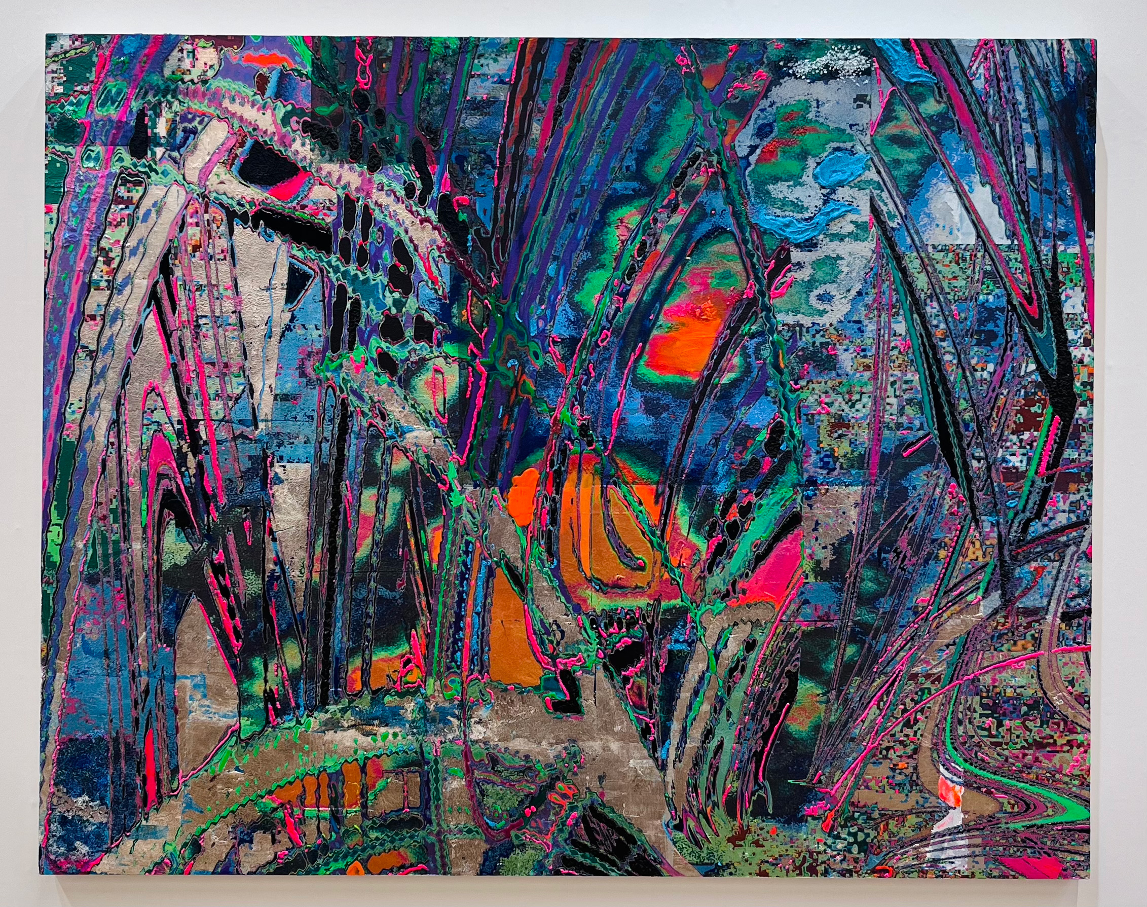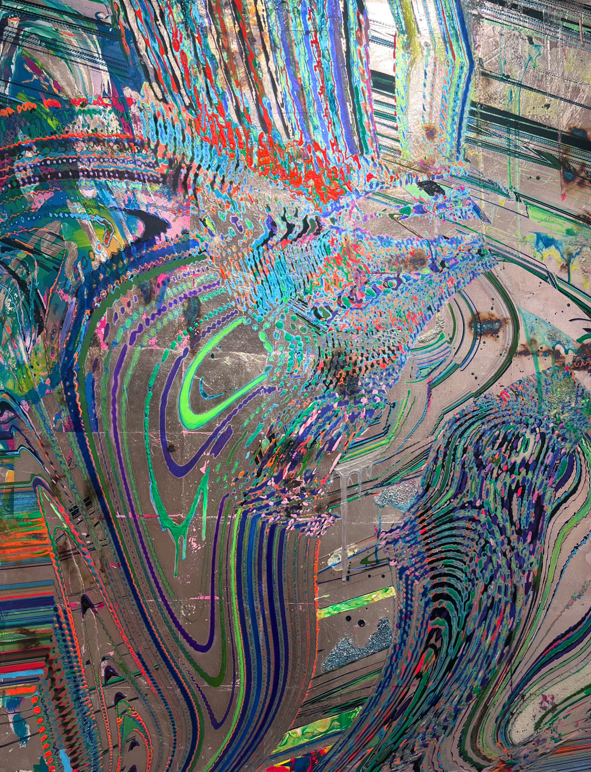 具象的な存在を抽象化し銀箔などの上にUVインクジェットという印刷技術を用い印刷、さまざまなマテリアルを用い、ペイントを加えるなどして重ねていく。