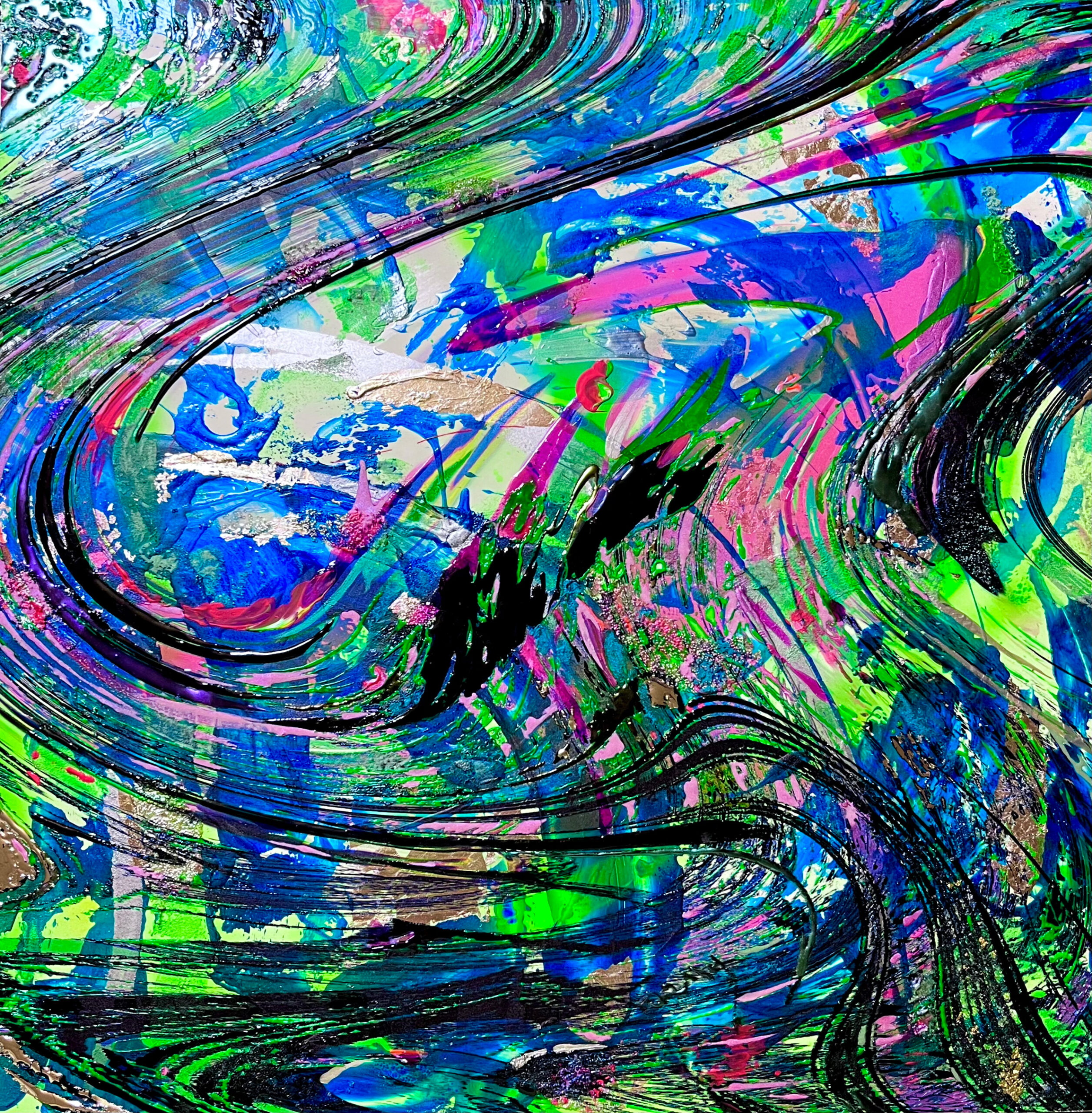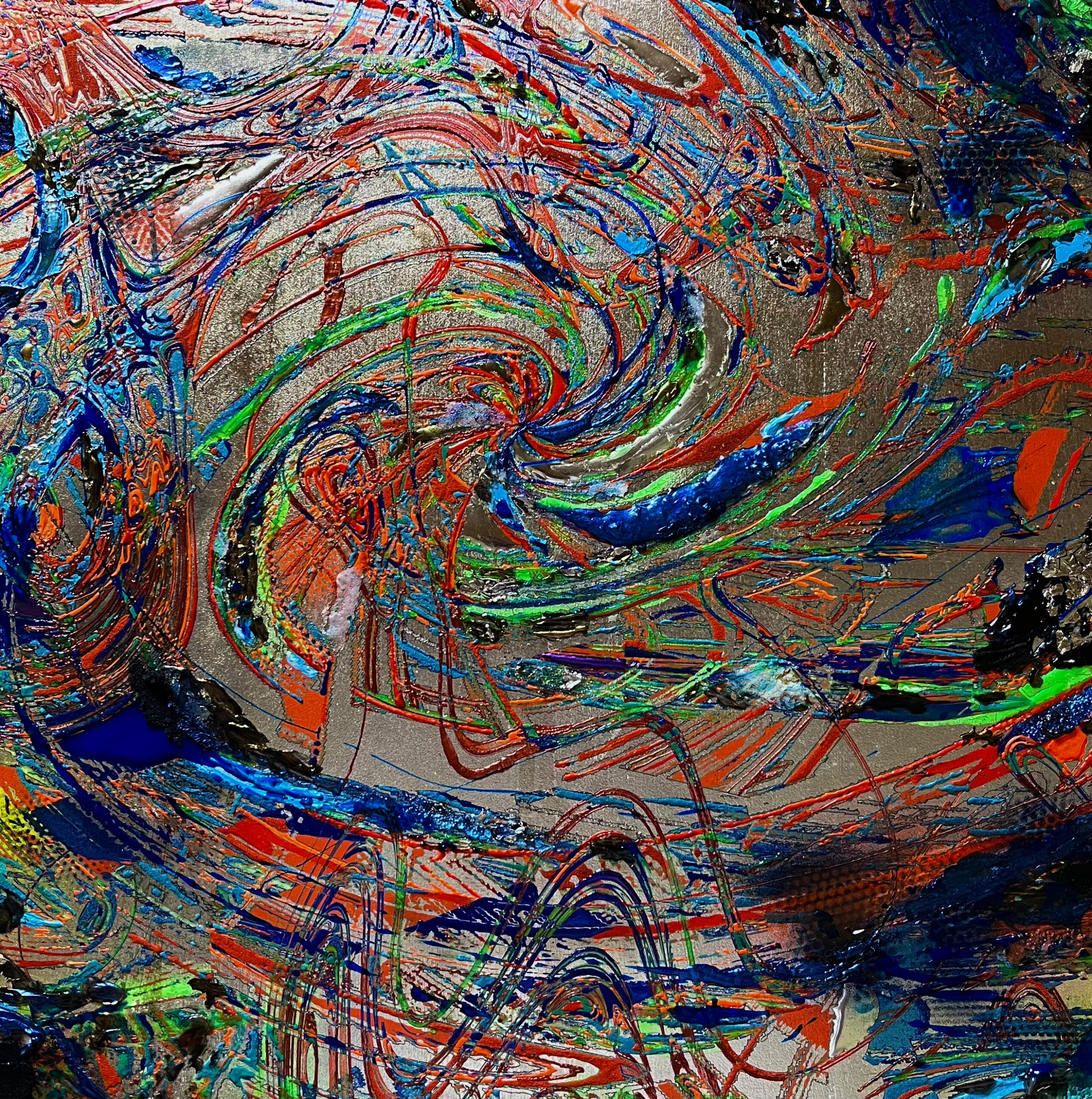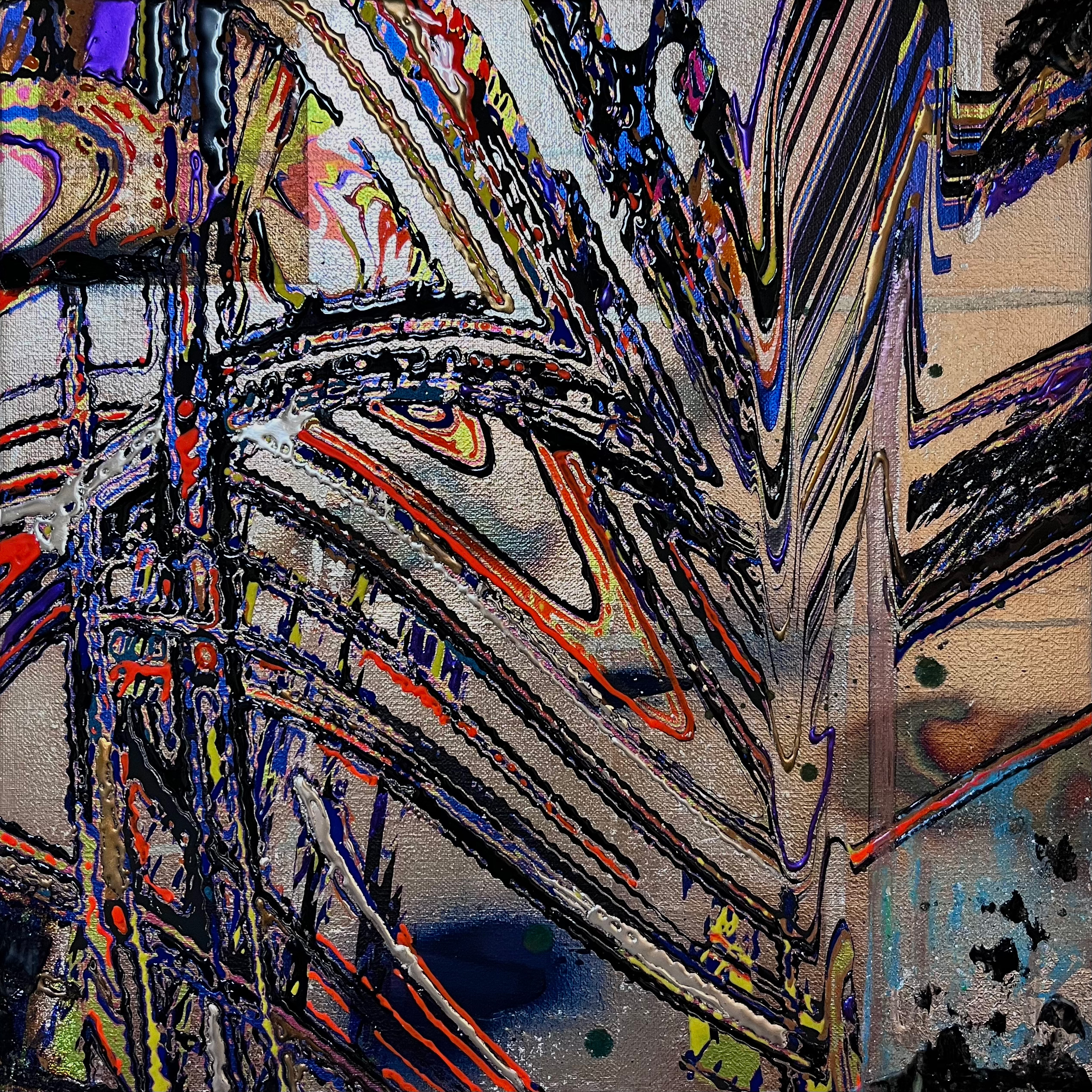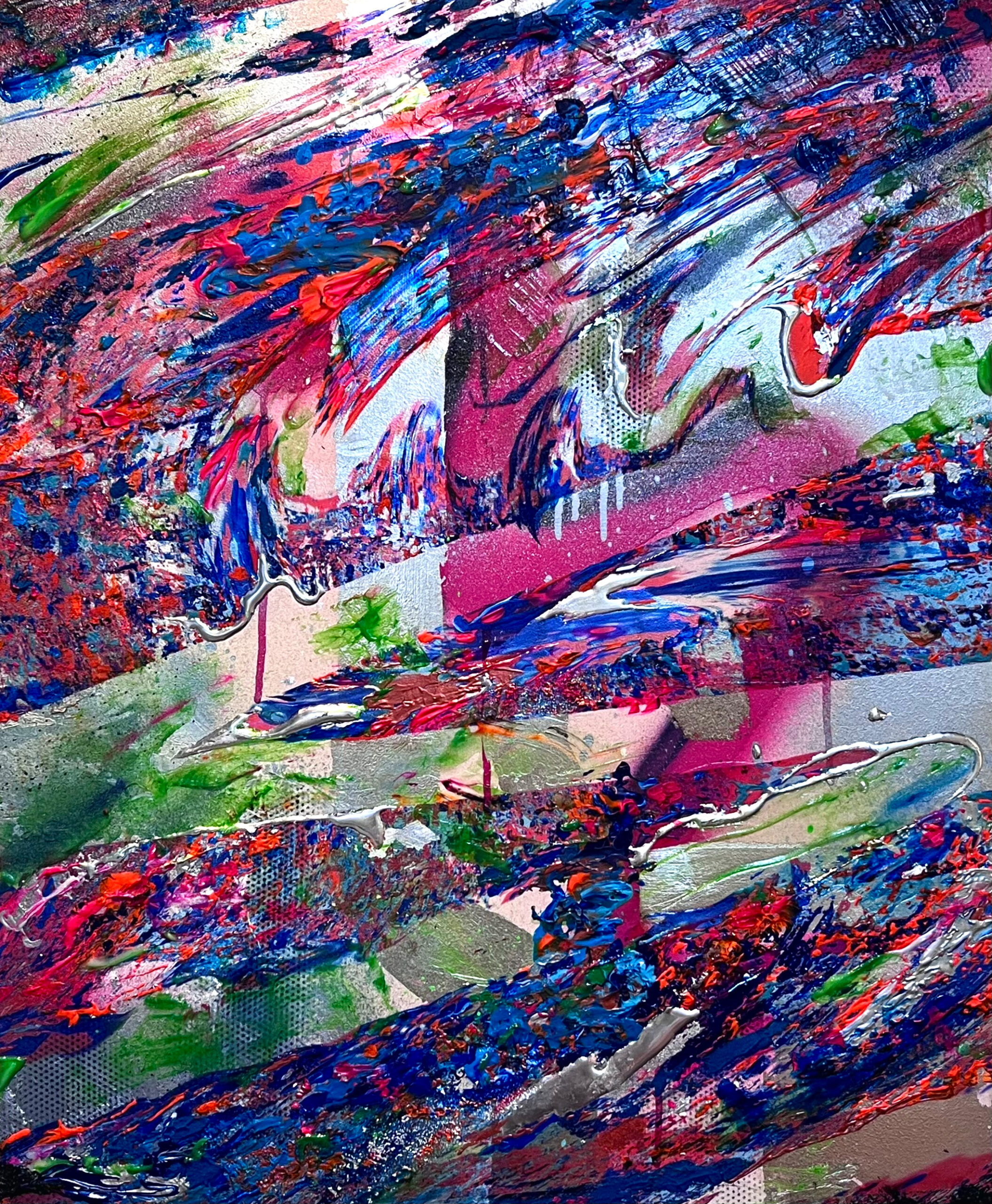 具象的な存在を抽象化し銀箔などの上にUVインクジェットという印刷技術を用い印刷、さまざまなマテリアルを用い、ペイントを加えるなどして重ねていく。
