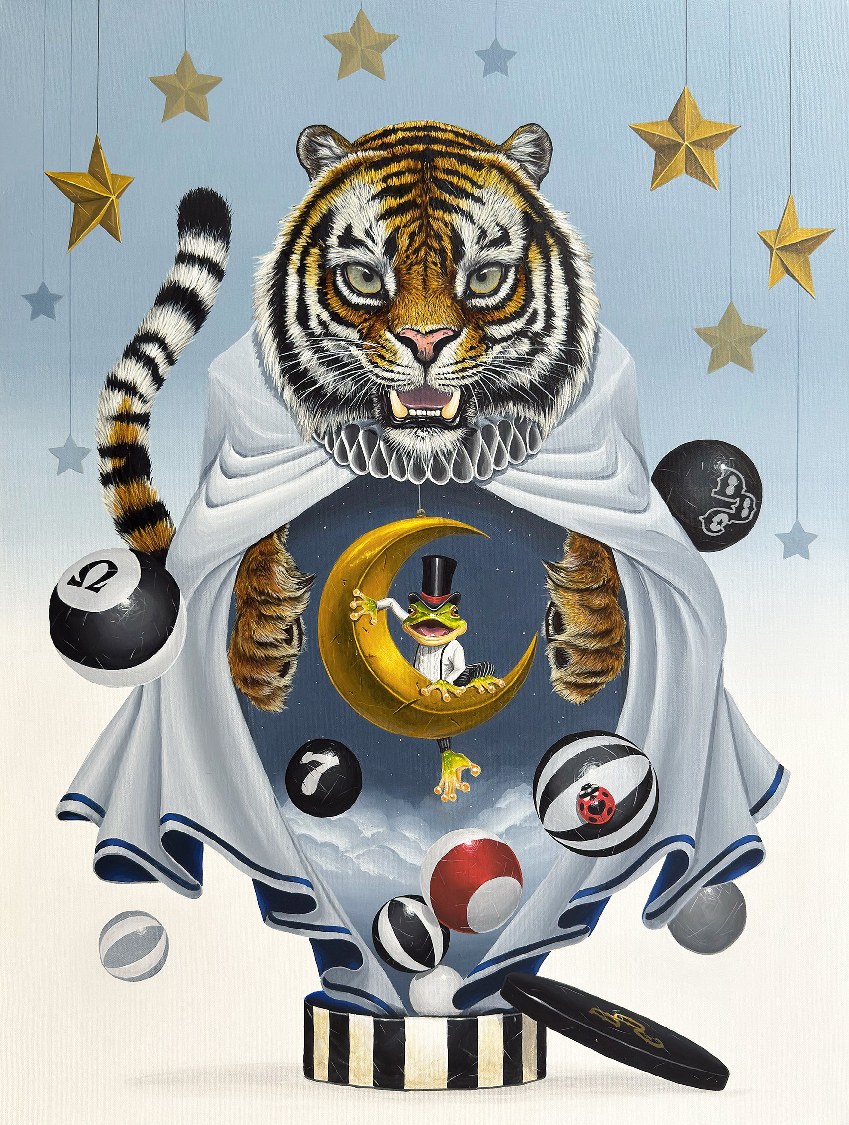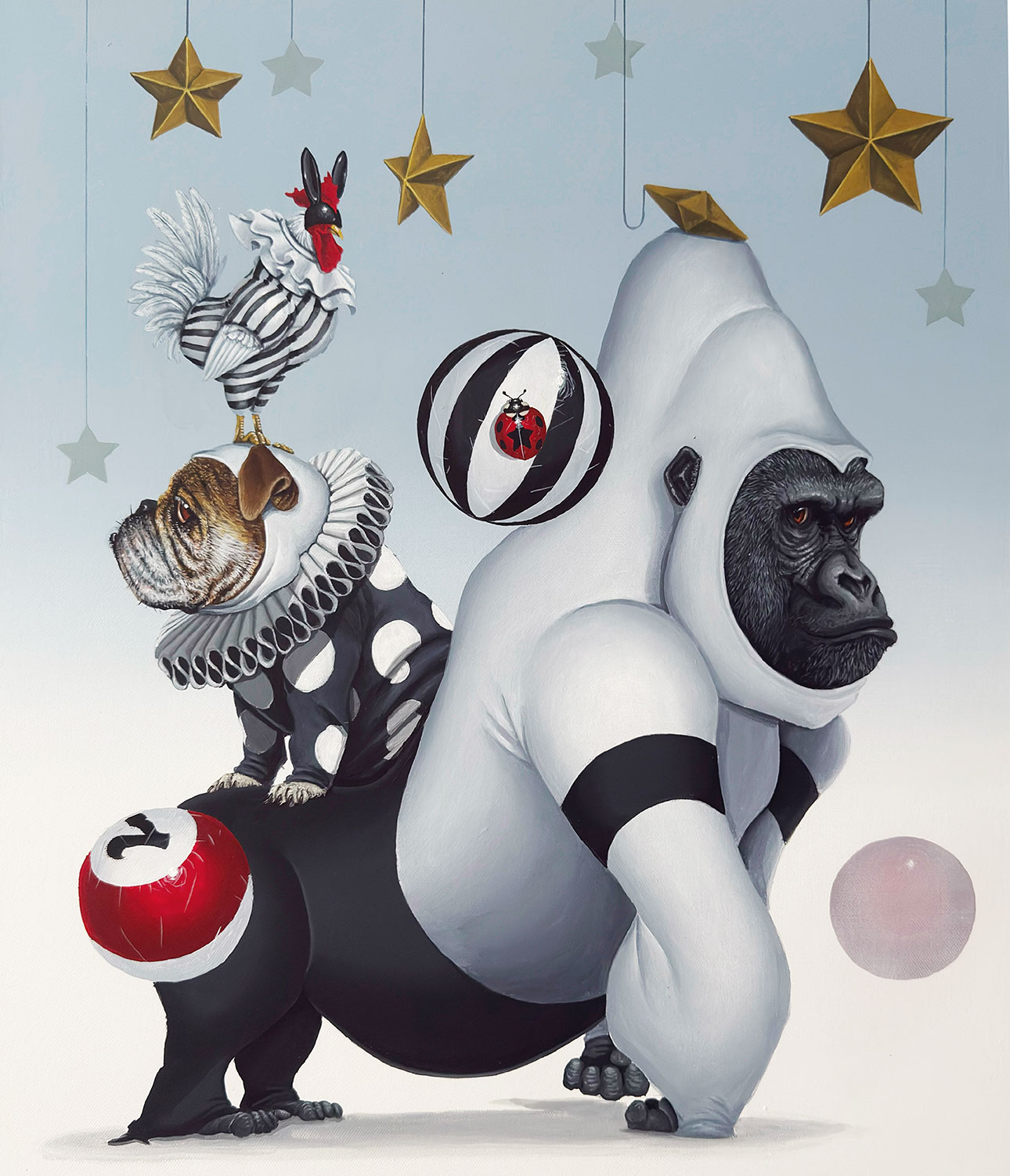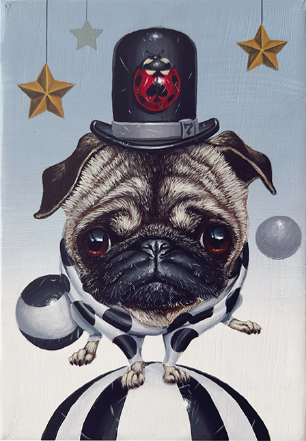 動物を擬人化する表現手法を通じて、動物が内包する力強さや美しさ、そして「生きること」の本質を主題とした制作を行っています。