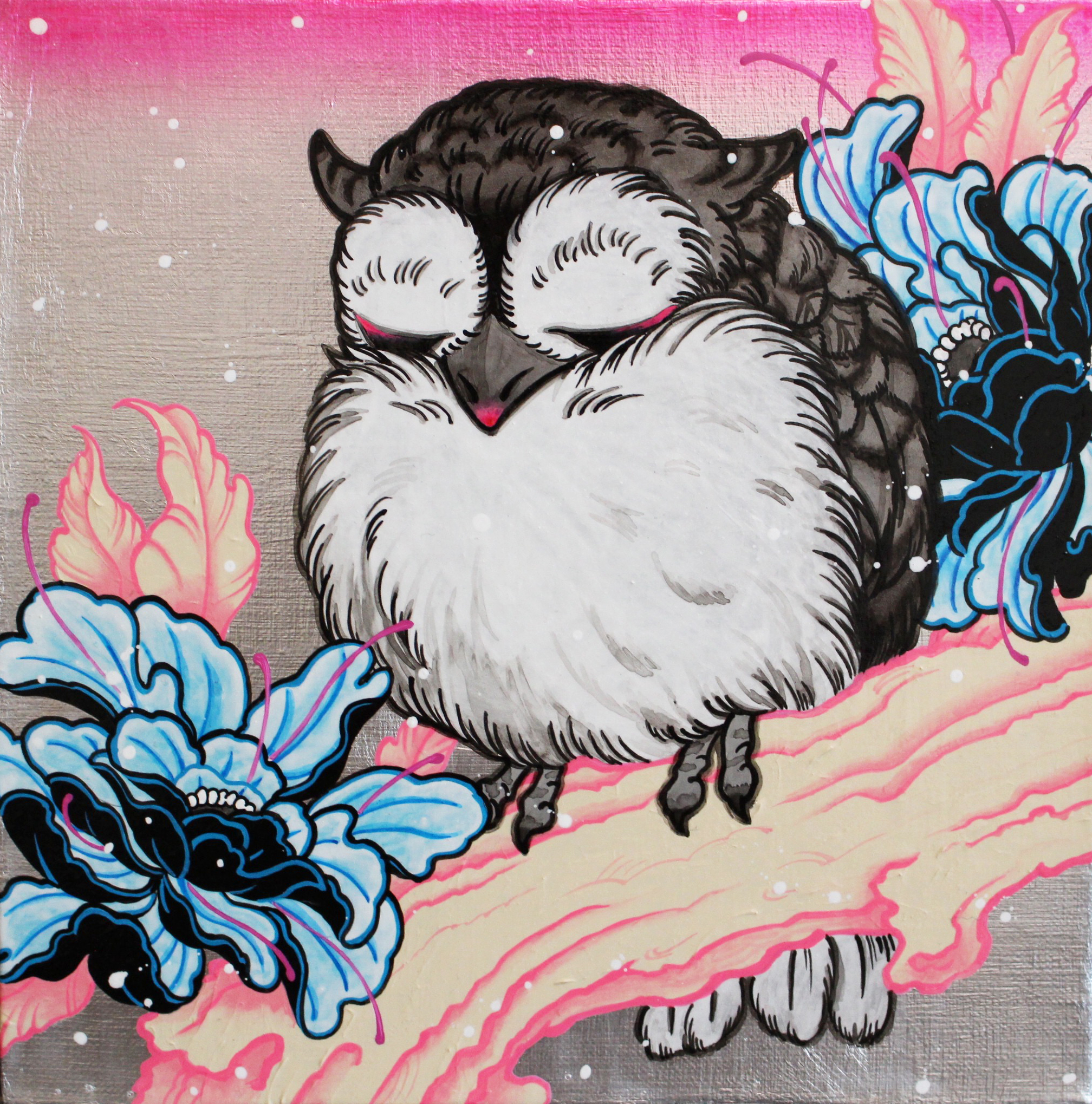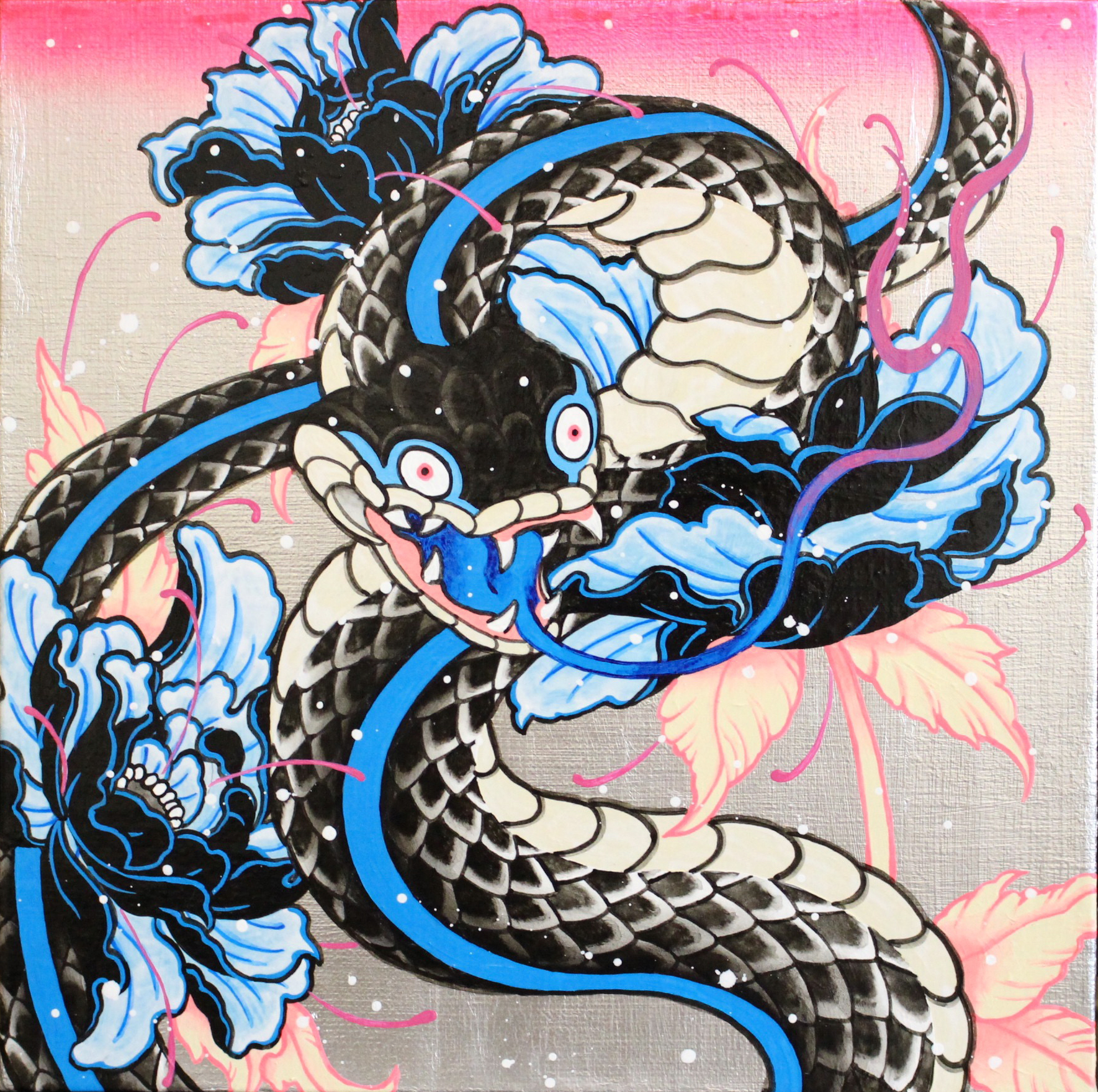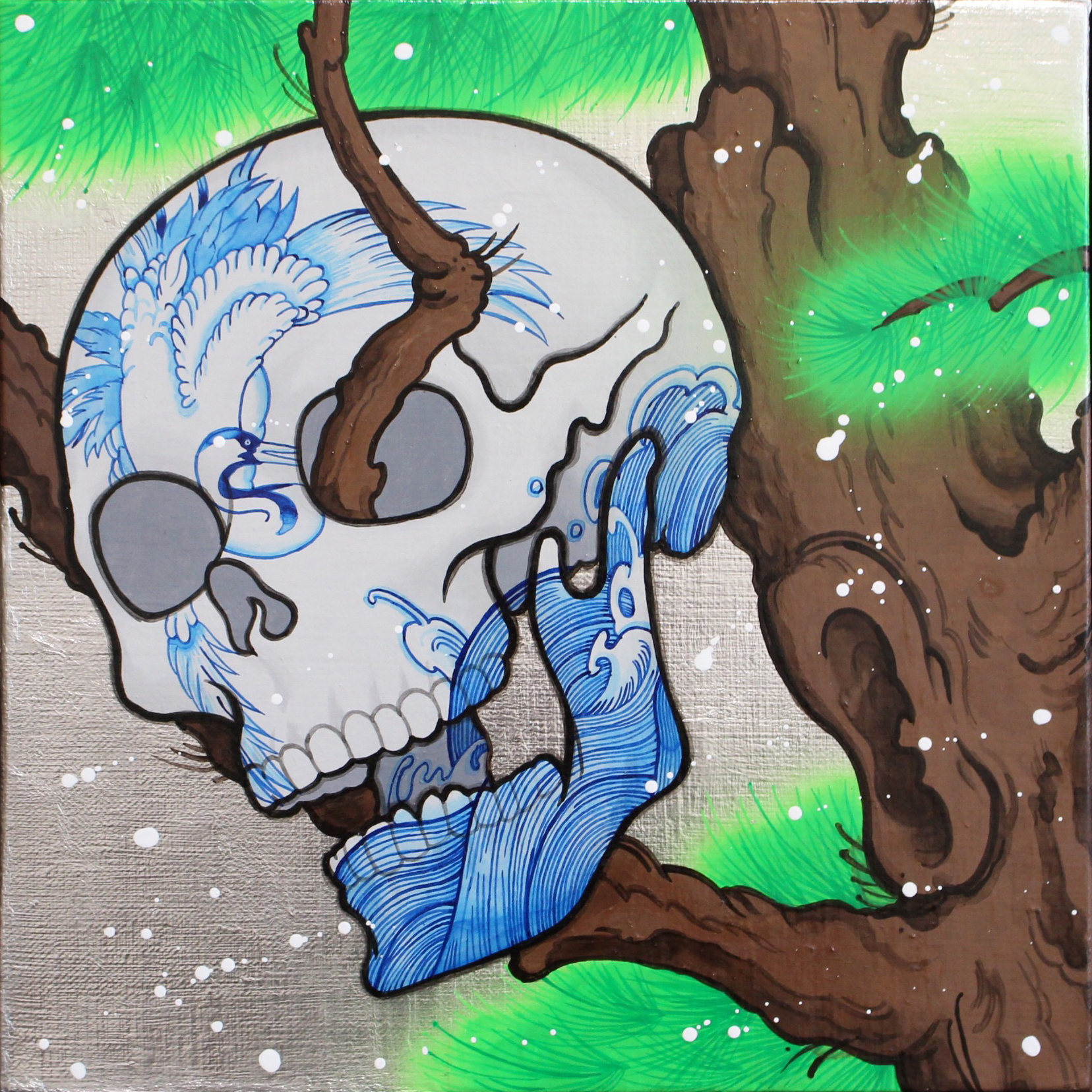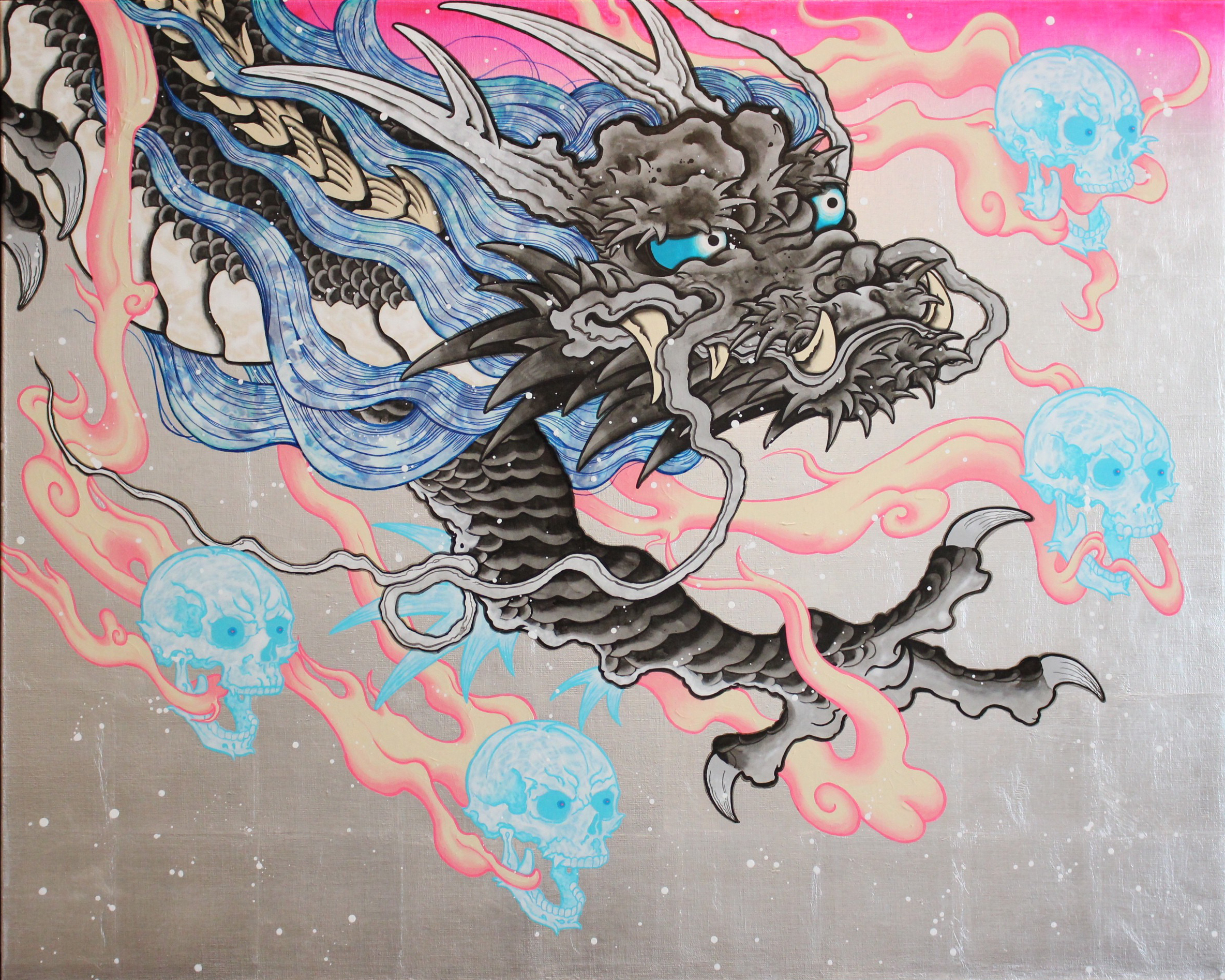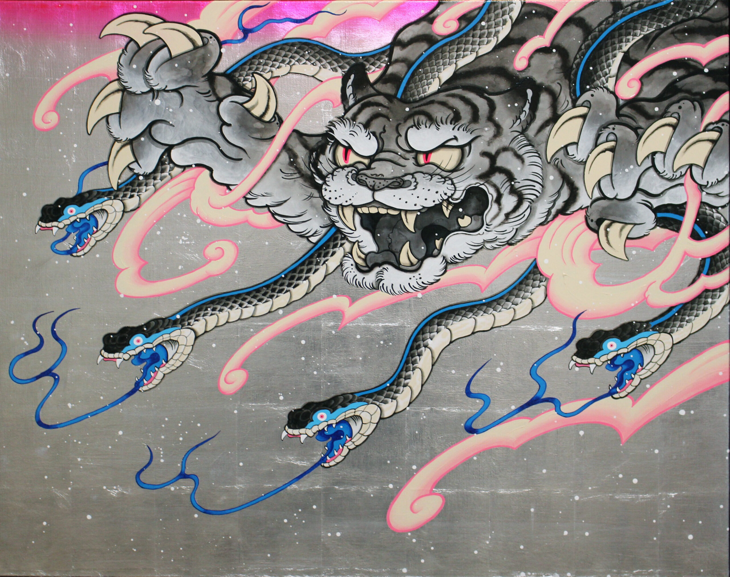 そこで、日本の伝統的な材料とエアブラシやアクリル絵の具などの現代の技術を融合させながら、