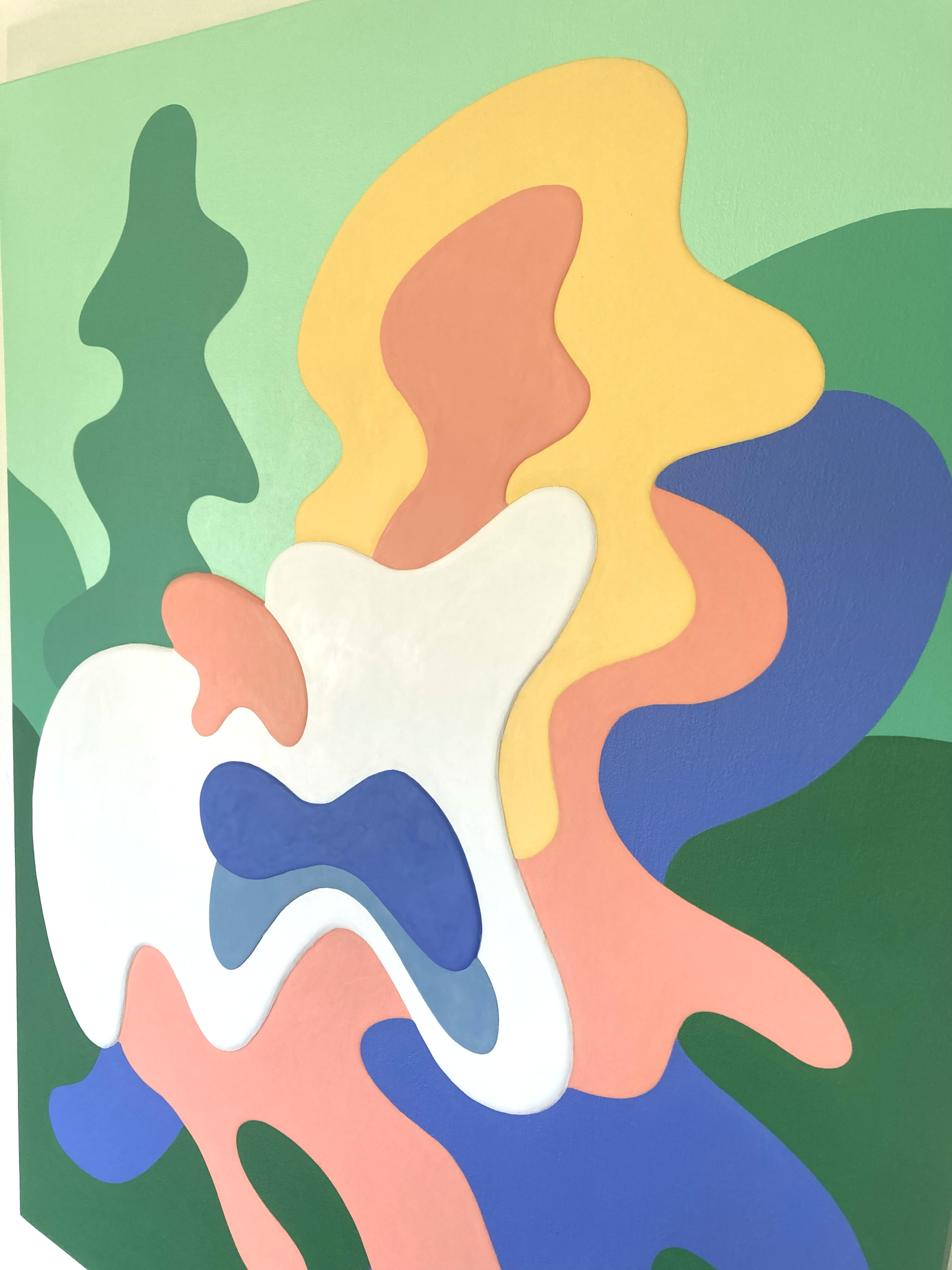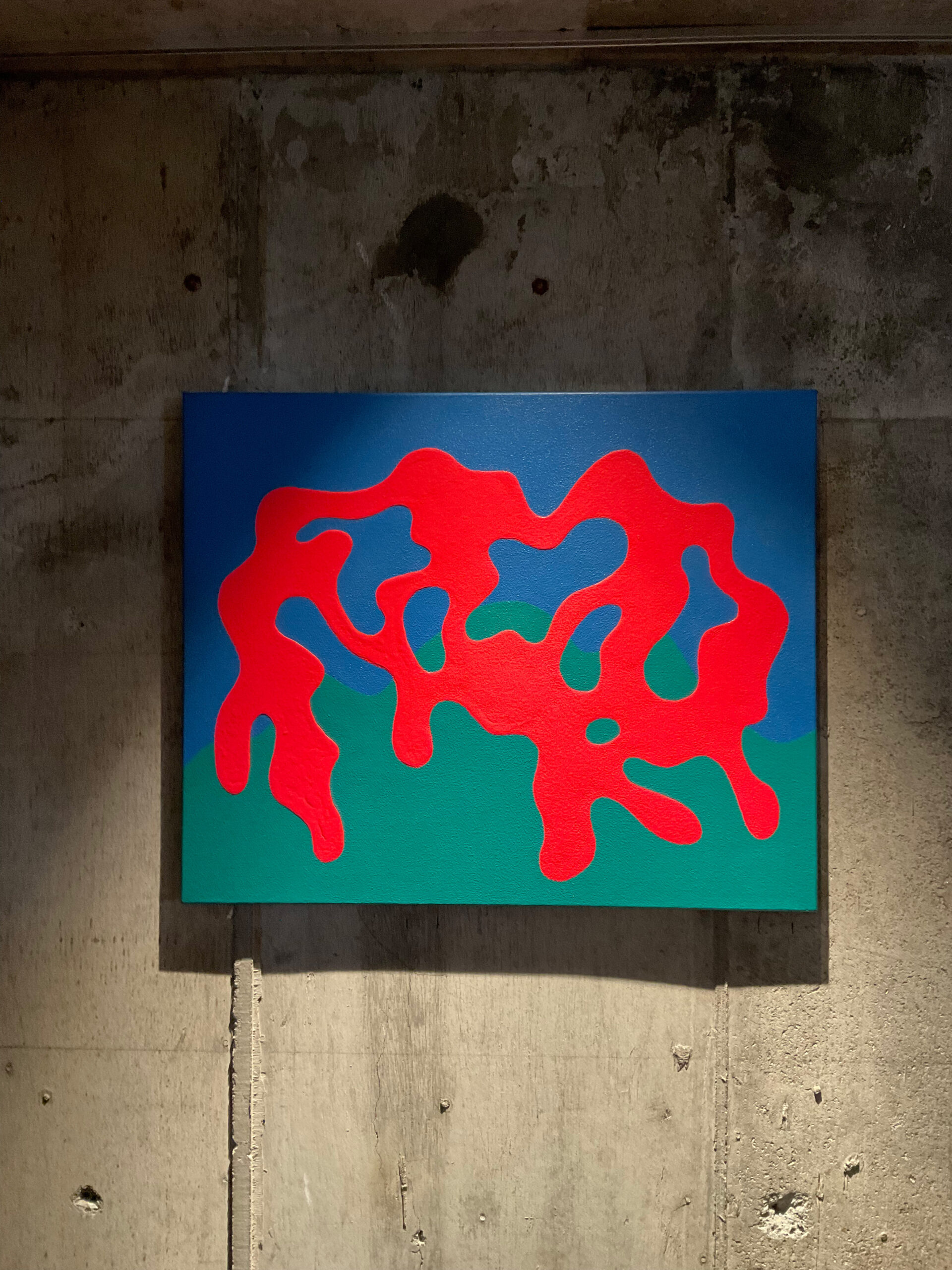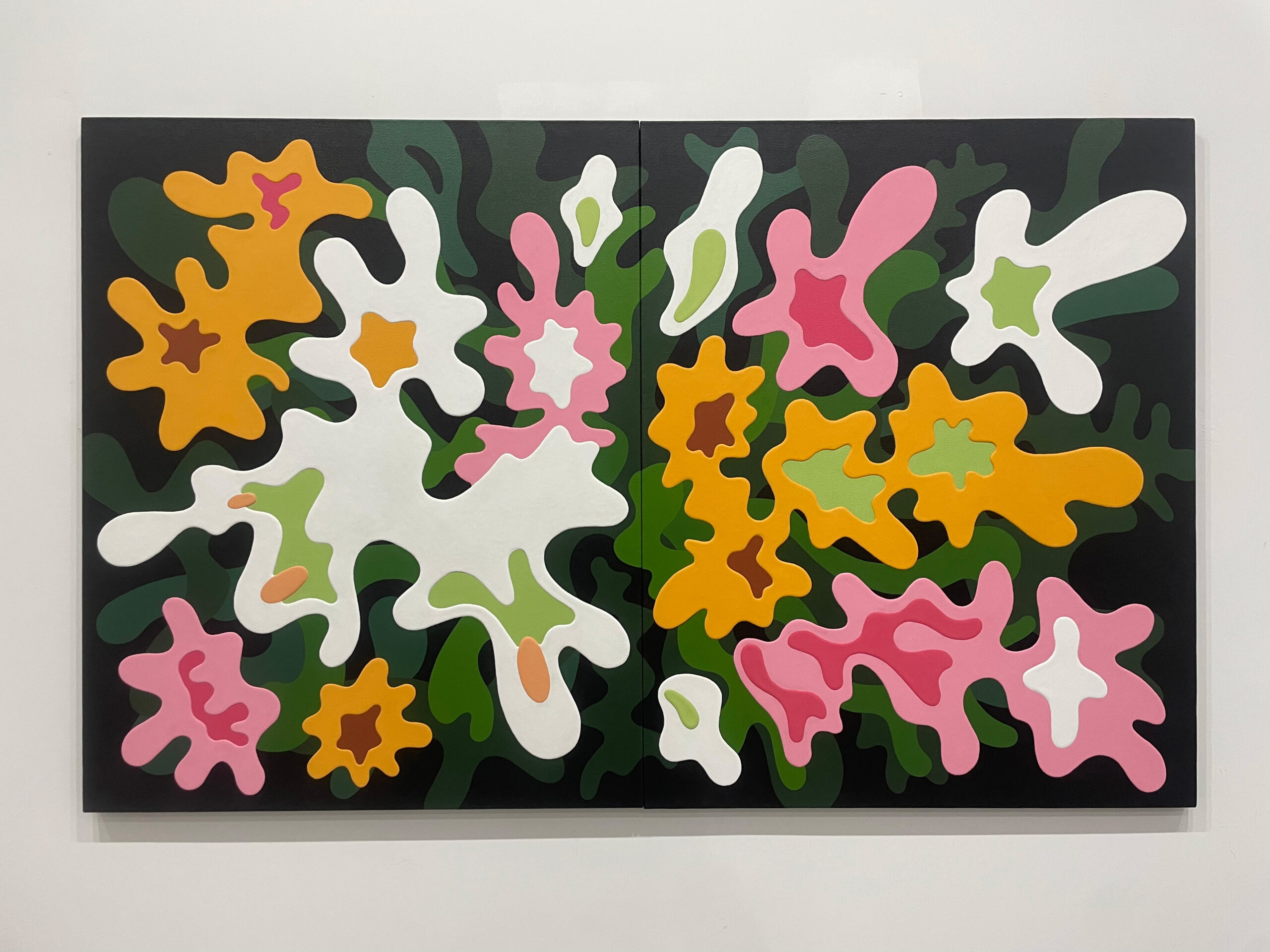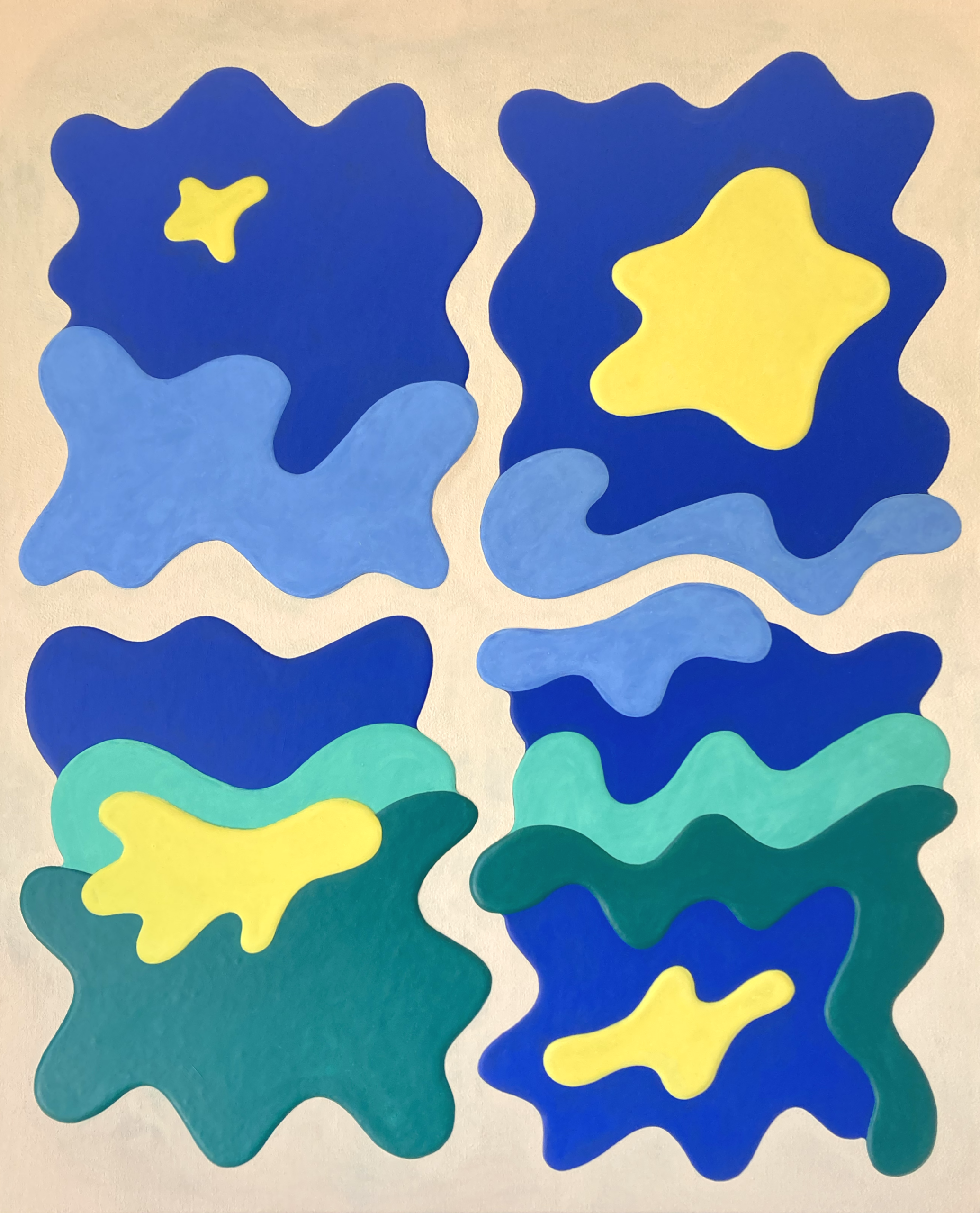 アクリル絵具を幾重にも重ね、明確な形と曖昧な形のあいだを行き来する画風は、