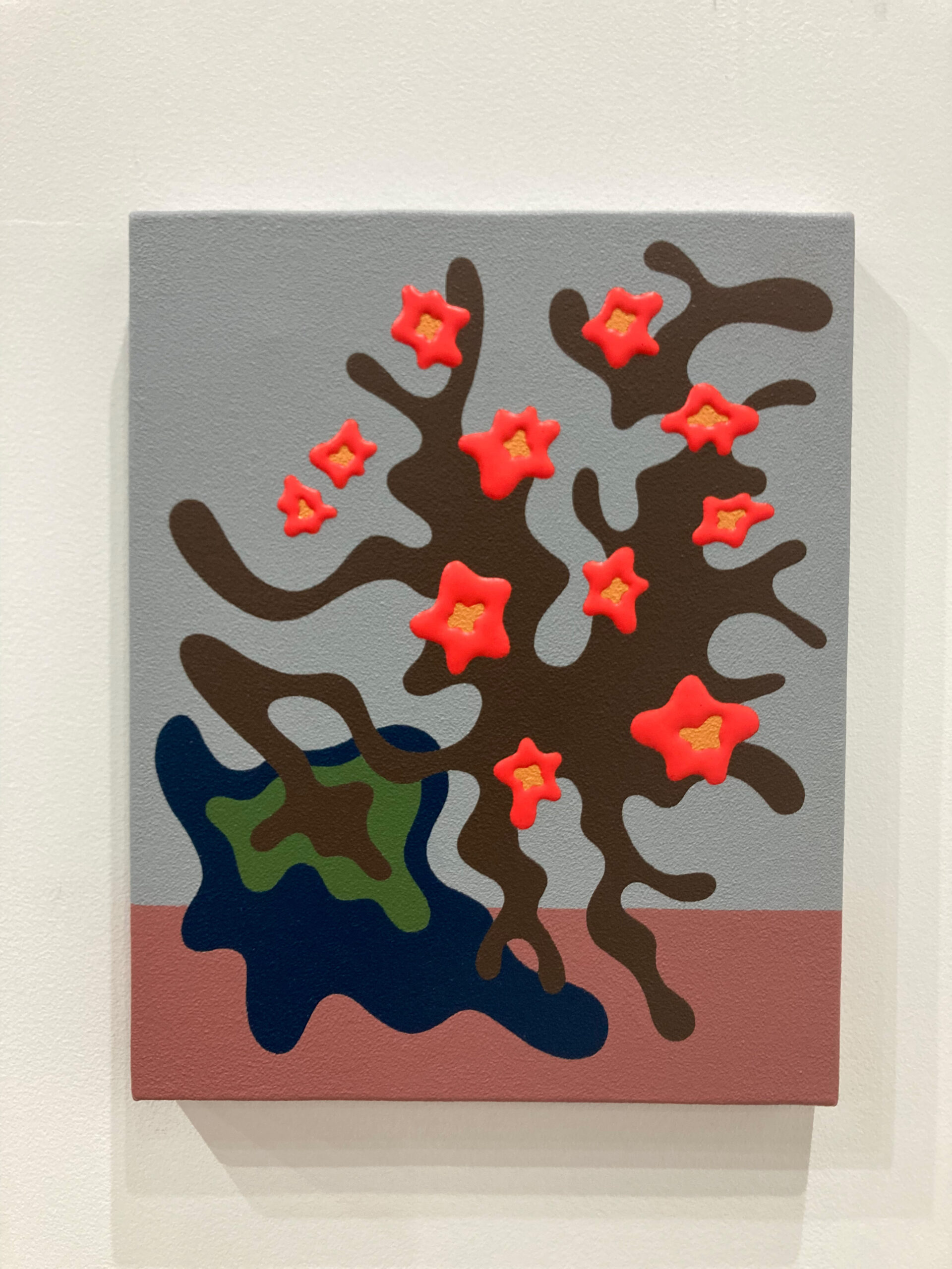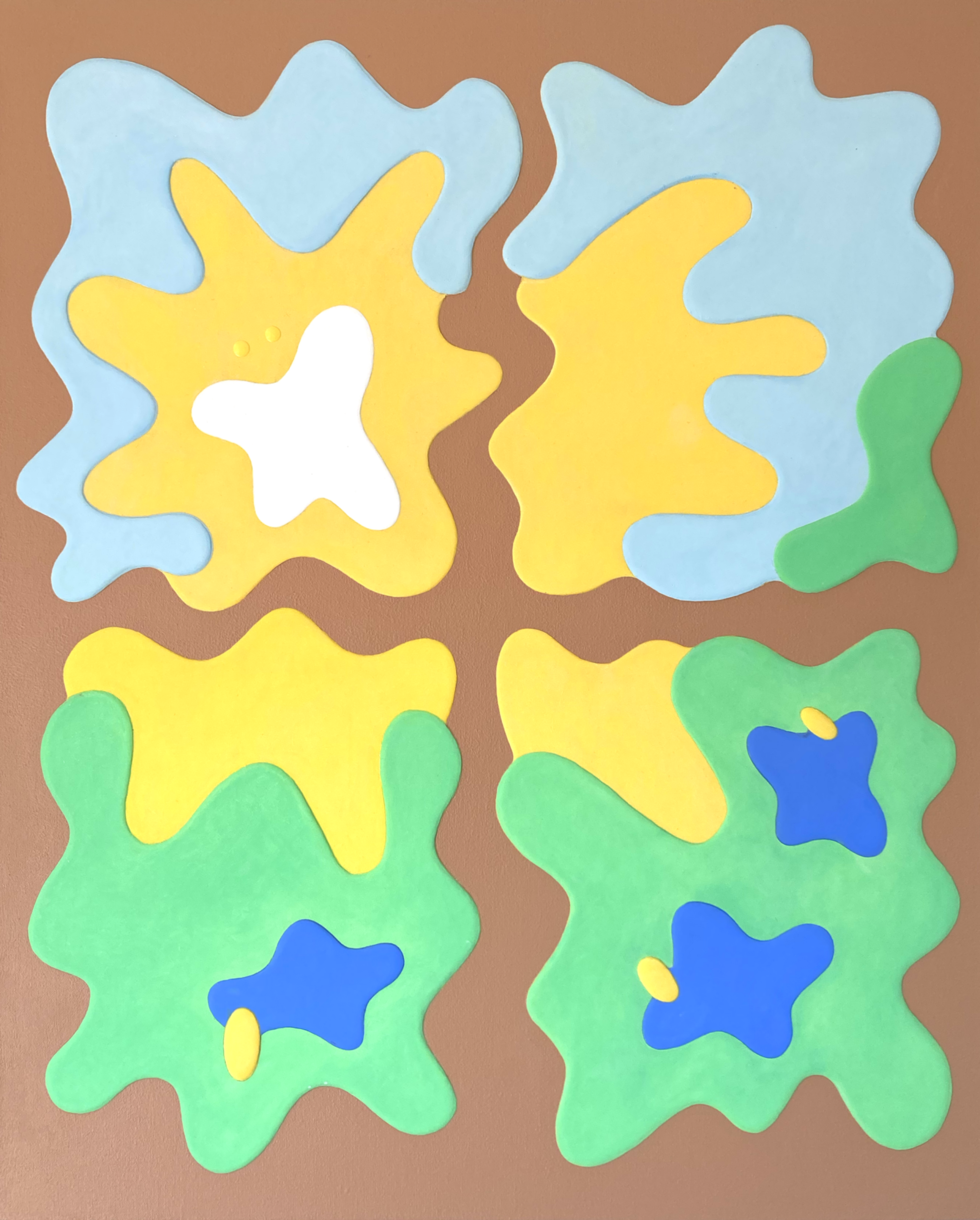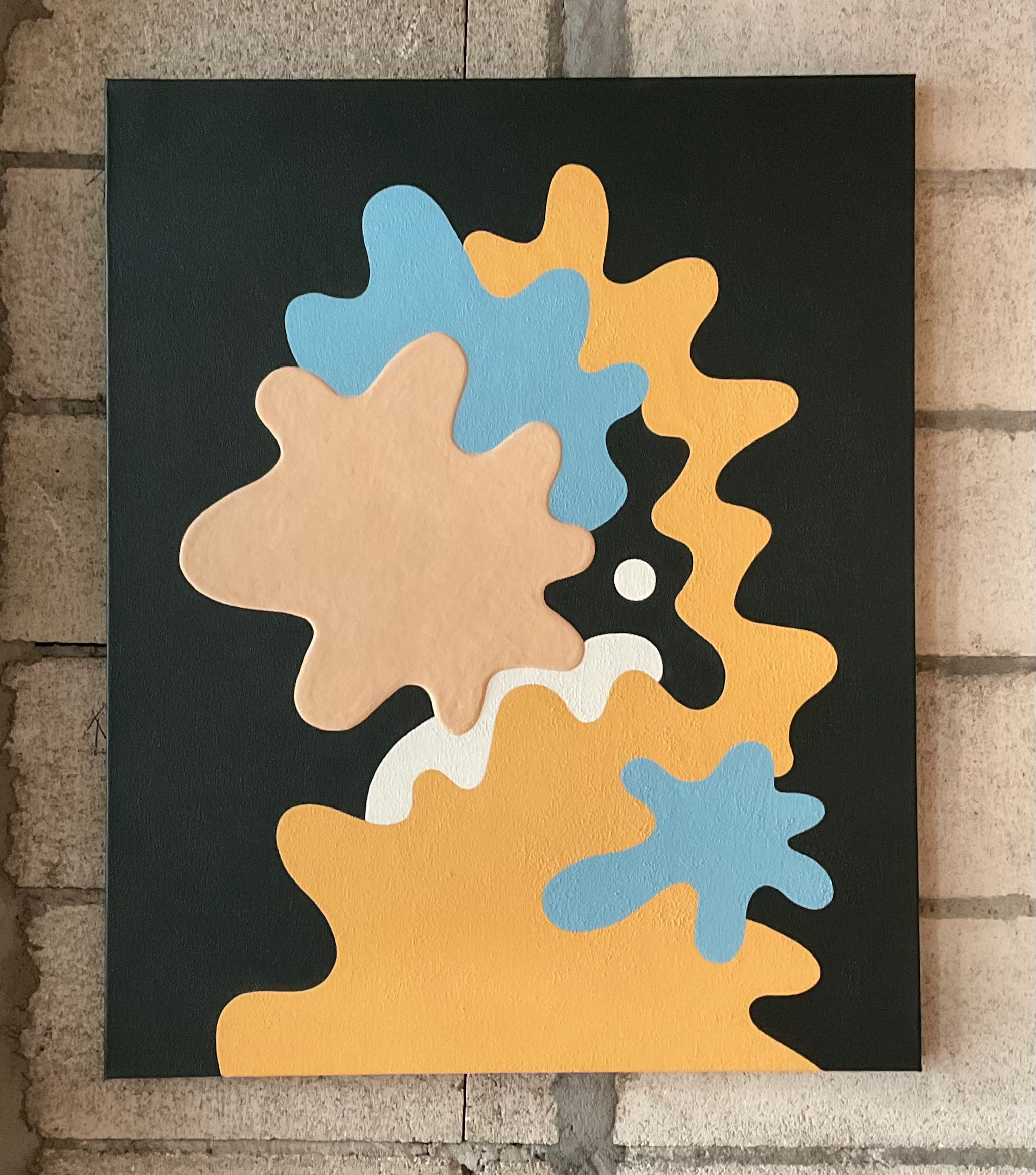 アクリル絵具を幾重にも重ね、明確な形と曖昧な形のあいだを行き来する画風は、