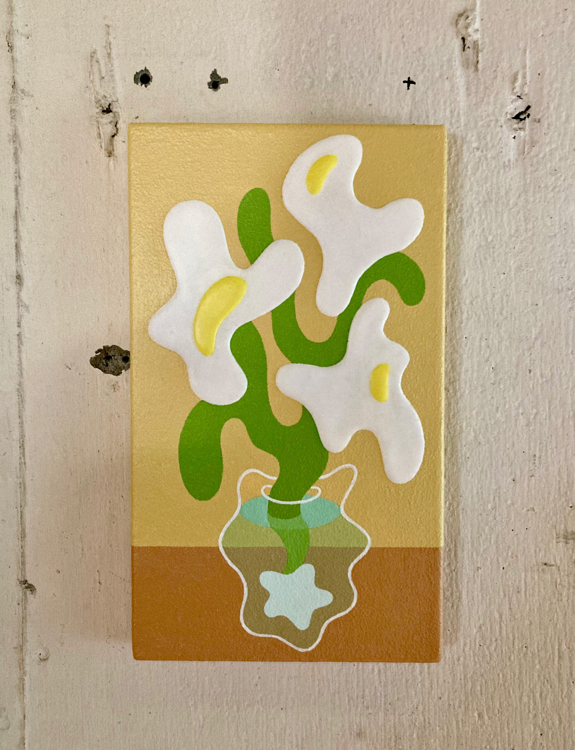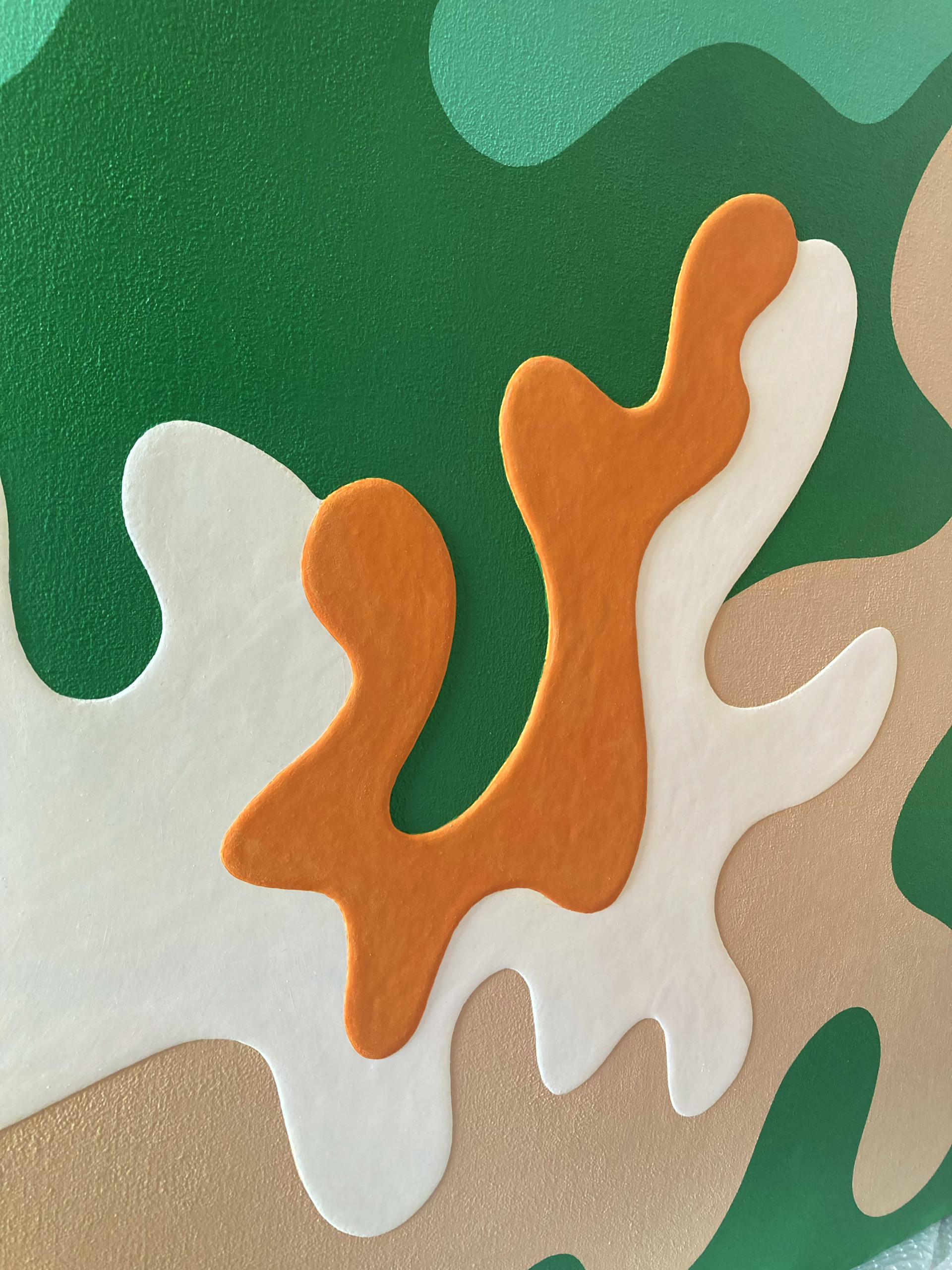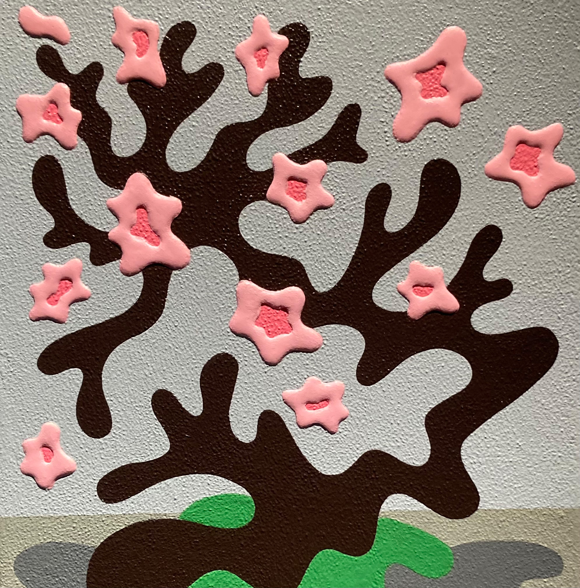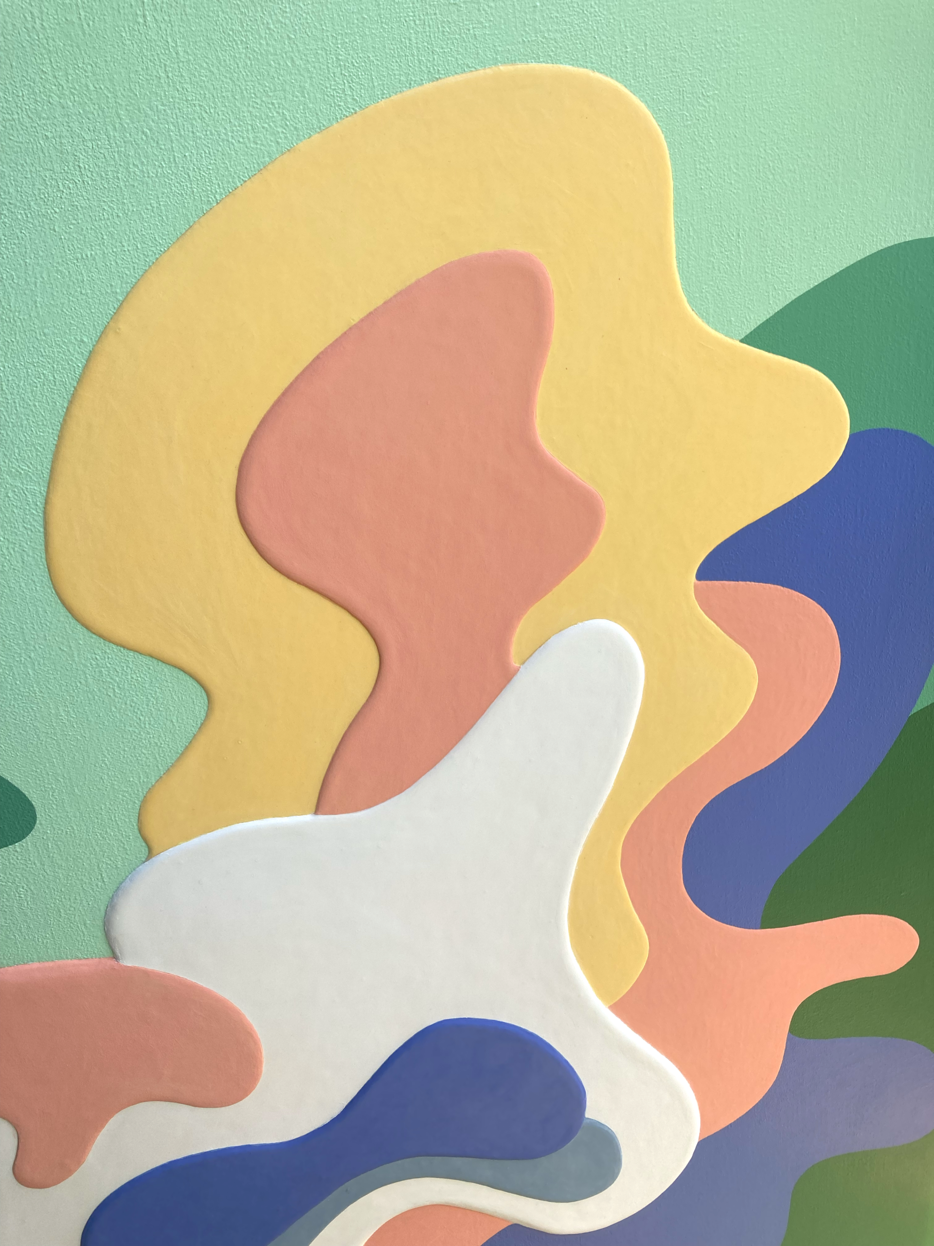 アクリル絵具を幾重にも重ね、明確な形と曖昧な形のあいだを行き来する画風は、